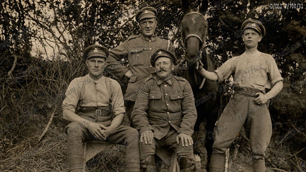 Following the successful stage adaptation of Michael Morpurgo’s book War Horse, Durham County Record Office has revealed they have a very similar real life story contained in a diary held by the archives. Sergeant George Thompson from Sunderland enlisted in the 7th Battalion The Durham Light Infantry in 1910, and in 1928 he wrote an account of his wartime experiences for his young daughter. Three generations of the Thompson family had worked at the Vaux Brewery in Sunderland where George probably worked with the dray horses. In April 1915 he went to France and drove limber wagons carrying rations and ammunition to the front line. His concern for his horses is evident throughout the diary; he even built a stable for one horse who was suffering from a skin condition to save it from being destroyed. Remarkably, one of the two horses he took to the front from Sunderland survived until the end of the war. Location: Vaux Brewery, Sunderland SR5 1SU Image shows one of the war horses, courtesy of the Trustees of the former DLI and Durham County Record Office Report presented by Jo Lonsdale