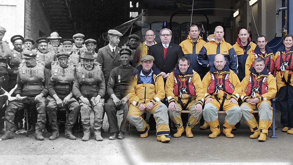 The lifeboat crew, like those around the country, were very busy during World War One because more boats were using the seas around Britain often with hostile motives. On 9 January 1917, a double rescue took place which would save the lives of 33 people. Legendary life boatman Henry Blogg led a crew of 40 volunteers to the aid of the Greek steam ship the Pyrin. Later that night they were called to help a second crew, this time on the Swedish ship the Fernebo which had struck a German mine. Blogg, who served 58 years on Cromer’s lifeboats, was awarded a Gold Medal for his leadership in the rescue. The Coxswain received a silver medal and 12 other crew received bronze awards. Peter Stibbons is a volunteer at Cromer Lifeboat here he tells the story of Blogg and his volunteers that extraordinary night. Location: Cromer, Norfolk NR27 9ET Image shows the Fernebo rescue crew in 1917, with the lifeboat crew in 2013 Historic image courtesy of Peter Stibbons Cromer RNLI, who also presents the story