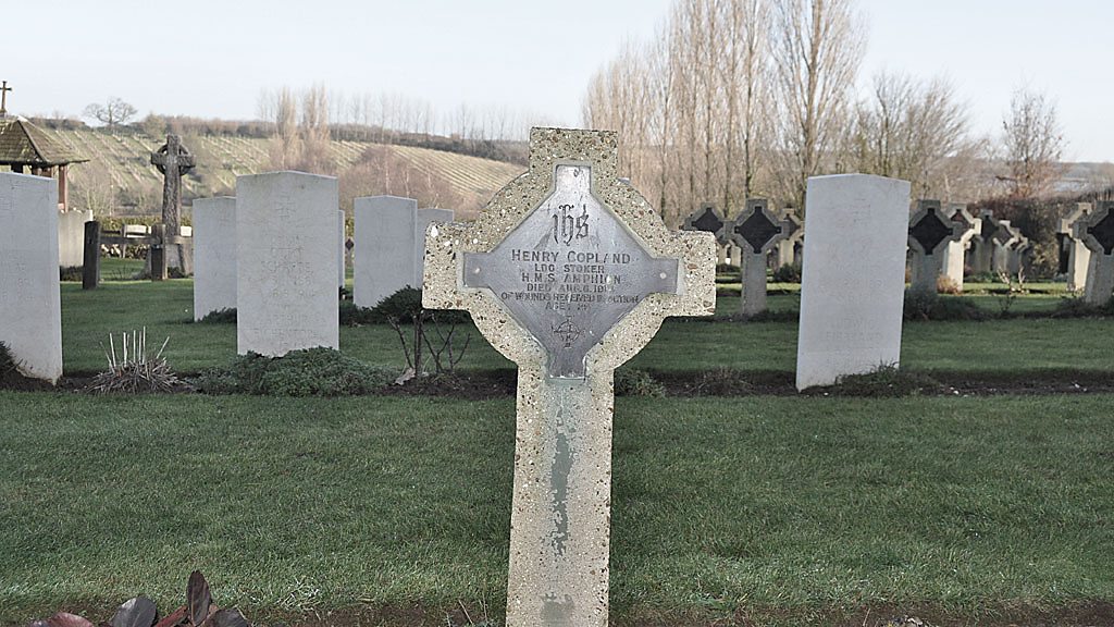 On the night of 5 August 1914, HMS Amphion was part of a flotilla of ships which set out from Harwich. They were told the German minelayer Königin Luise had been seen “throwing things overboard”. The flotilla chased and the Königin Luise was sunk. The Amphion picked up the 46 German survivors and continued on her search mission. At 06:30 the following morning, when on her way back to Harwich, the Amphion struck a mine laid by Königin Luise and began to sink, partly on fire. The official press bureau report says: “all efforts were therefore directed to placing the wounded in a place of safety in case of explosion and towards getting her a tow by the stern. By the time destroyers closed in it was clearly time to abandon ship. The men fell in with composure and 20 minutes after the mine struck, the men, officers and captain left their ship.” Minutes later she exploded and within 15 minutes had sunk completely. It resulted in 149 Commonwealth sailors being killed; two more died of their injuries in Shotley Hospital and are buried in Shotley Naval Churchyard. Nineteen of the German sailors who had been rescued from the Königin Luise also died. The following day Winston Churchill, the First Lord of the Admiralty, in the House of Commons said the Admiralty was saddened, but “not at all alarmed or disconcerted” by the incident. He used his speech to announce the creation of a Press Bureau to provide “a steady stream of trustworthy information… which, without endangering military or naval interests, will serve to keep the country properly and truthfully informed from day to day of what can be told, and what is fair and reasonable; and thus, by providing as much truth as possible, exclude the growth of irresponsible rumours.” Location: St Mary Naval Churchyard, Shotley IP9 1ES Image shows the churchyard today