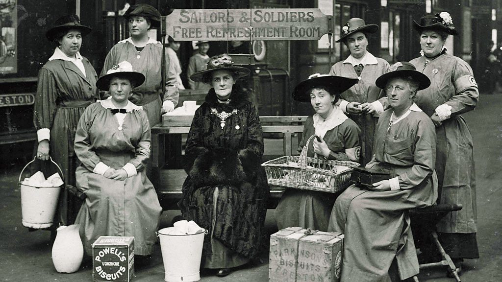Millions of troops on their way to the battlefields of World War One were fed and watered thanks to round-the-clock efforts of a team of women volunteers at Preston railway station. The Preston Soldiers' and Sailors' Buffet was set up in 1915 following concerns that many men were turning up in the town with no money for food or drink, having hurriedly left their jobs to join up. In late 1914, more than two hundred miners from Tonypandy in South Wales had to sleep rough on the streets of Preston and beg for food. The women realised the town wasn't coping. They organised themselves into rotas, working 12-hour shifts to provide a 24-hour service in what is now the Stattin's waiting room. As well as food and drink, there were pens and paper so the men could write home. Tired soldiers and sailors could also get some sleep, safe in the knowledge that the women would wake them up in time to catch their train. When the troops didn't have time to get off their train, the women went onto the platforms to hand out tea in special mugs. Those mugs were often kept as souvenirs and even taken to the trenches. The Buffet operated beyond the end of the fighting until 1919. Location: Preston, Lancashire PR1 8AP Image shows women from Preston hosting a buffet for soldiers, courtesy of Harris Museum and Art Gallery Report presented by Tim Padfield