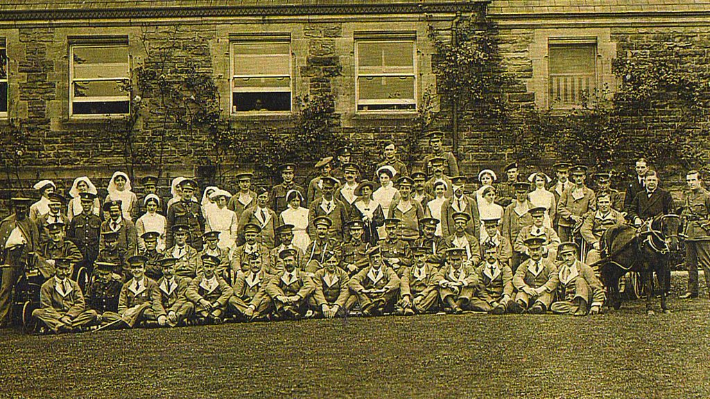 A Russian Grand Duchess, stranded in Harrogate at the start of World War One, founded five hospitals in the town to treat injured soldiers returning from active service. Her Imperial Highness Grand Duchess Georgievna Romanova was in Harrogate on 4 August 1914, as the war started. Her daughters were being treated for ailments at one of the town’s spas. The first hospital she founded was Tewit Well, with fewer than 20 beds. However, she soon realised that she needed larger premises so acquired Heatherdene. Subsequent sites were used as the war progressed. According to newspaper reports; by the end of the war 100,000 soldiers were treated by the Grand Duchess. Her nursing team often included other titled ladies from across the globe. During her time as a nurse, the Grand Duchess even contracted lice. Today, the original building at Heatherdene is just a car park, although the gateposts from the premises still exist. Location: Harrogate and District NHS Foundation Trust car park, Harrogate, North Yorkshire HG2 7SX Photograph of Heatherdene with patients and staff, courtesy of Walker-Neesam Archive