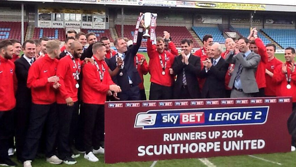 Scunthorpe United players celebrate League Two promotion on an open top bus tour.
