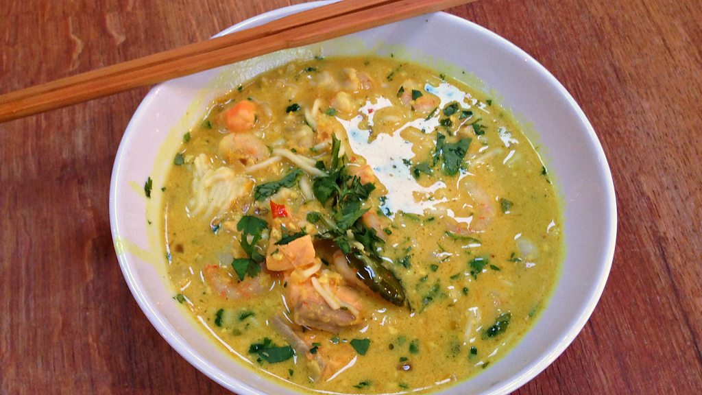 Ghillie Basan makes a Singapore laksa combining both Chinese and Malay cuisines.