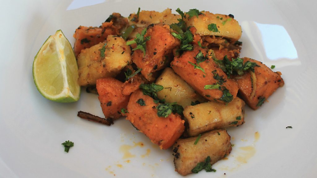 Ghillie Basan prepares Roast Sweet Potato with Banana and Jerk Spices