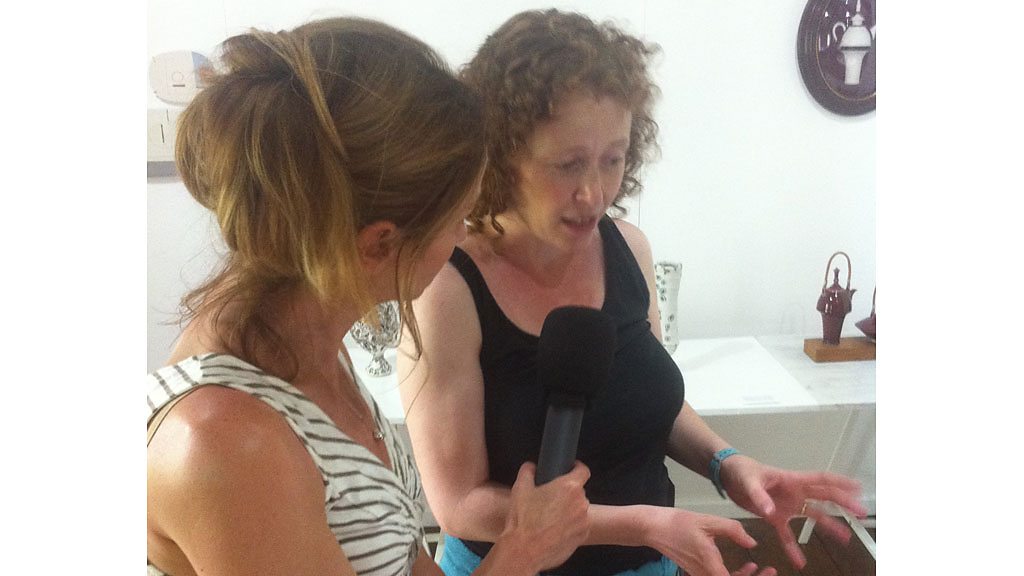 Y crochenydd Lowri Davies yn trafod arddangosfa newydd yng Nghrochendy Nantgarw.