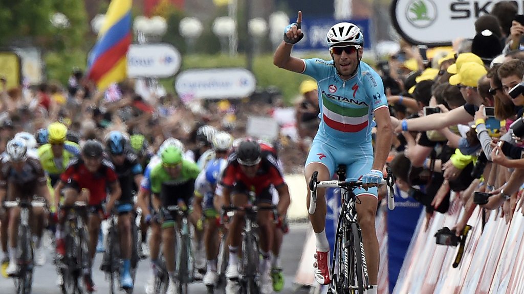 Italian cyclist Vincenzo Nibali has won stage 2 of the Tour de France in Yorkshire. Taking the yellow jersey, Nibali broke away in the final kilometre of the stage which ran from York to Sheffield. This clip is from 5 live at the Tour de France on Saturday 5 July.