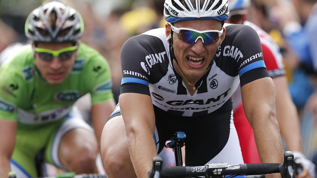 German Marcel Kittel continued his Tour de France domination in a sprint finish of the fourth stage from Le Touquet to Lille. Norwegian Alexander Kristoff and Frenchman Arnaud Demare Kittel battled hard in the final kilometre to finish second and third respectively. Defending champion Chris Froome fell early, suffering a wrist injury and had to wear a splint for the rest of the race, but recovered to finish among the peloton. This clip is from 5 live sports extra on Tuesday 8 July 2014.