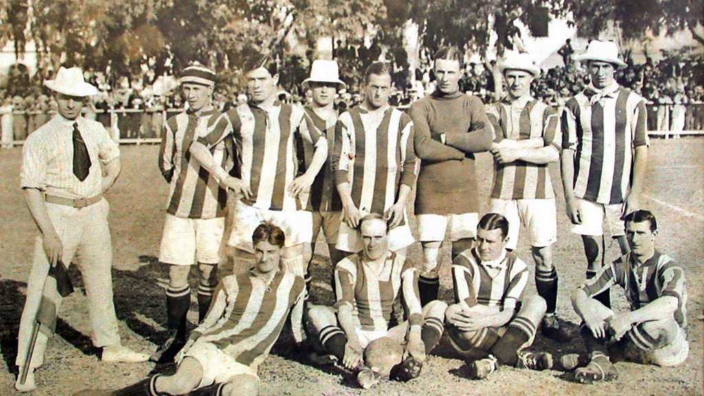 When war was declared on 4 August 1914, Exeter’s football team was a boat in the Atlantic. The team had just played Brazil and 15 players were sailing back from a tour in South America and the ship was shot at. All were to serve in World War One and all were to survive. The touring team of Exeter City FC was a thankful team. But while some returned to football after the war, and even played for England, others would never play again. The club did lose men. Exeter’s amateur players were the first to enlist and to die (the captain of the 1913/14 season George White was the very first). But the ‘tourists’ – those who had played in Brazil, were all to survive the conflict. The first player of the touring team to sign up was Fred Goodwin. He was to be joined by other members of the team which played Brazil in the summer of 1914. He would not play football after the war, nor would his teammate Bill Smith. Both were injured in battle. Sam Strettle served at Ypres, won the military medal and returned to football in 1919. Local player, fisherman and goalkeeper Dick Pym would serve with the Devon regiment and then play for England after the war. Location: St James Park, Exeter EX4 6PX Photograph of the team playing in Brazil 1914 courtesy of Paul Farley from Exeter City FC