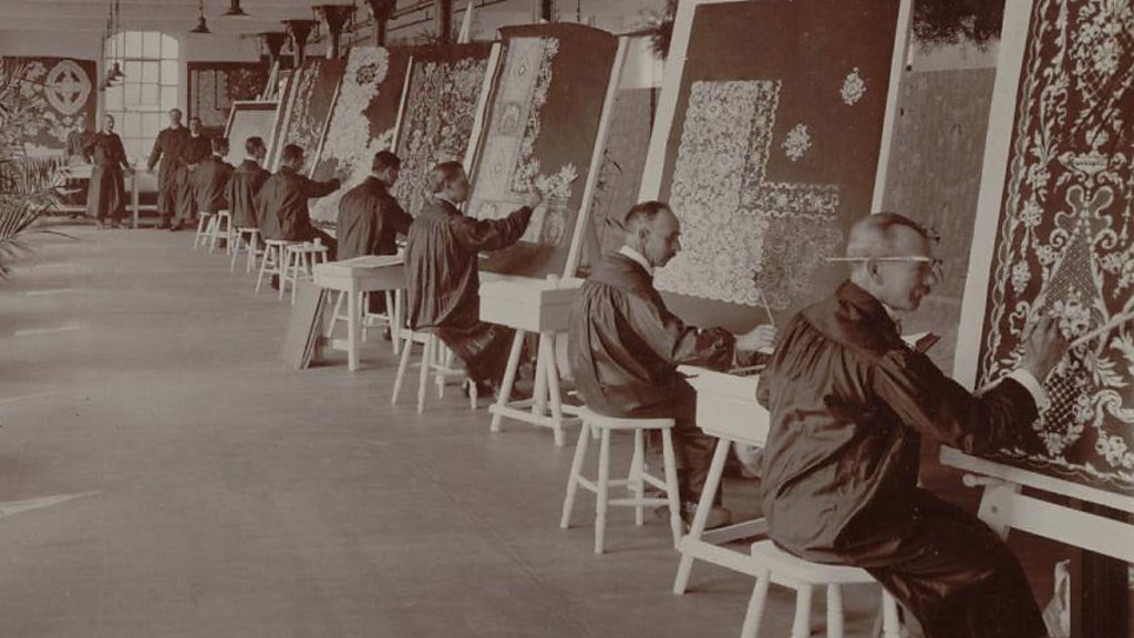 World War One prompted radical changes in women’s fashion. Before the war, fashion was still influenced by the Victorian period. After the war design was more modern and clean. These changes were a major factor in the decline of Nottingham’s lace industry. Before the war, Nottingham’s lace market enjoyed it’s heyday. The lace industry employed thousands of people. In 1910 Nottingham exported £5m of lace with women’s fashion relied heavily on lace. The trend was for women to wear long skirts, petticoats, elaborate underwear, collars and cuffs, made partly or entirely of lace. After WW1 the lace trade declined and never recovered its pre-war prominence. Fashion after the war was very different. Designs were more modern, less fussy and cleaner. Post-war fashion was influenced by the fact that more women were working, playing sports and driving cars - all of which are difficult if you are weighed down with bundles of lace. Location: Broadway Lace Market, Nottingham NG1 1PS Image: Birkins design room in 1914, courtesy of Amanda Briggs-Goode
