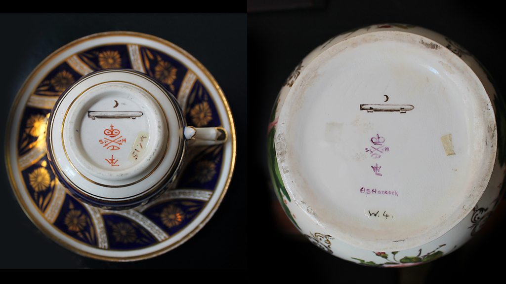 During the night of 31 January 1916, a German Zeppelin airship dropped bombs on Derby; killing five people. On the night of the raid the Sampson and Hancock factory on King Street was firing a kiln. S and H is now part of Royal Crown Derby. When the air-raid siren was sounded the kiln fires had to be dowsed and it was not known if the contents would be ruined or not. When the kiln was opened the contents, around 100 pieces, were found to have fired well. In memory of the event the whole kiln load was marked with an airship and moon mark. There are two pieces in the museum and Royal Crown Derby, and a couple of others in private collections. What happened to all one hundred pieces in unknown. Location: Royal Crown Derby, Osmaston Road, Derby DE23 8JZ Image: Zeppelin marks on Royal Crown Derby china, courtesy of Jacqueline Smith