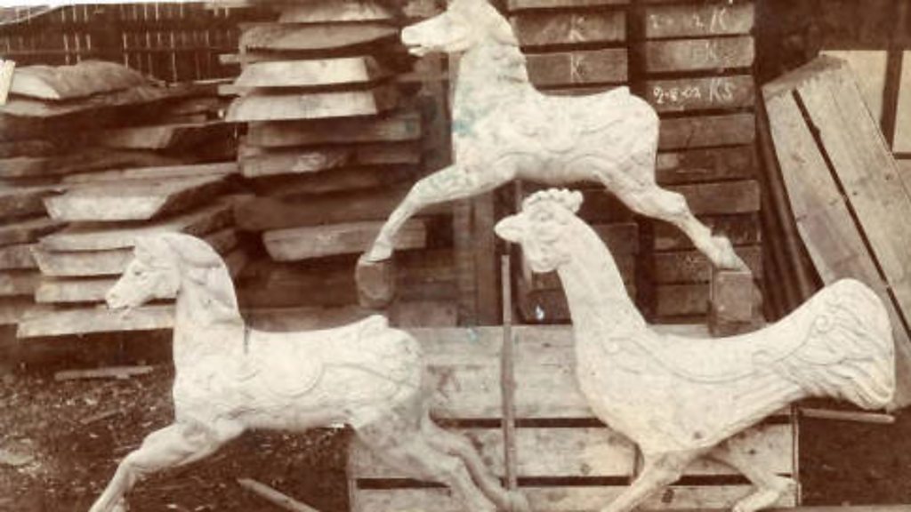 George Orton initially was a wheelwright and coachbuilder. Charles Spooner was a woodcarver. Both were based in Burton-on-Trent. The two firms worked together from 1894, and were referred to collectively as Orton and Spooner. Between them they made helter-skelters, switchback rides, elaborate carriages and scenic railways. In 1914, the government requisitioned their works. During World War One they made portable aircraft hangers. They were chosen for this work because of their expertise in building portable wooden structures. The company finally closed for business in 1977. Today a road in Burton is named after George Orton. Location: George Orton Court, Burton-on-Trent, Derbyshire DE14 2PD Image: George Orton Sons and Spooner Ltd works, courtesy of National Fairground Archive
