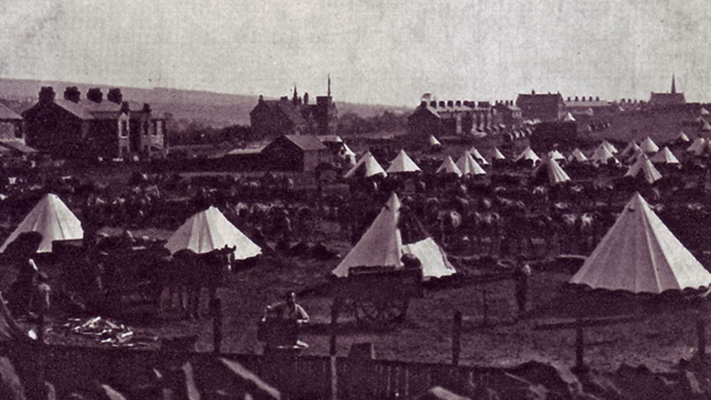 In August 1914, fields around the small village of Edgworth near Bolton were turned into a full blown army camp. More than 5,000 soldiers from the Lancashire Fusiliers camped with their support units between Edgworth and Turton Station. The men from Bury, Rochdale and Salford were Territorials- soldiers who had joined up before the war as part-timers. The local press described how on Sundays families from the three towns came to Edgworth to visit their loved ones. One newspaper commented how ''there was a carnival atmosphere.'' The troops finally left after a month before being sent to guard the Suez Canal and ultimately the landing at Gallipoli in Turkey in 1915. Many men failed to return. Location: Sharples Meadow, Edgworth, Lancashire BL7 0PE Image: View of the camp at Sharples Meadow in Edgworth, courtesy of the Fusiliers Museum. Bury