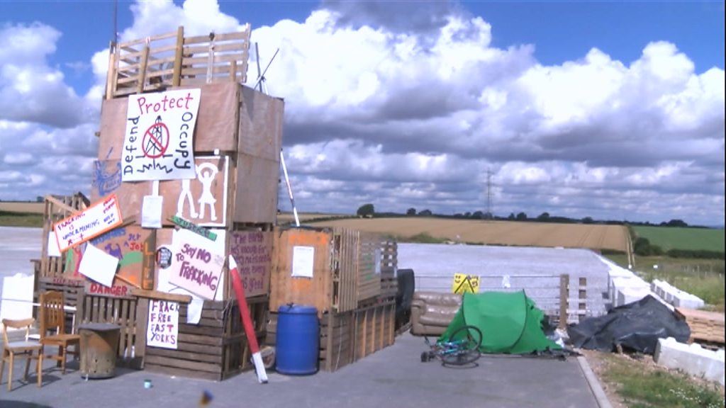 Chris Arundel has a look round the wooden barrier across the entrance to Rathlin Energy's oil and gas drilling site at Crawberry Hill in Walkington.