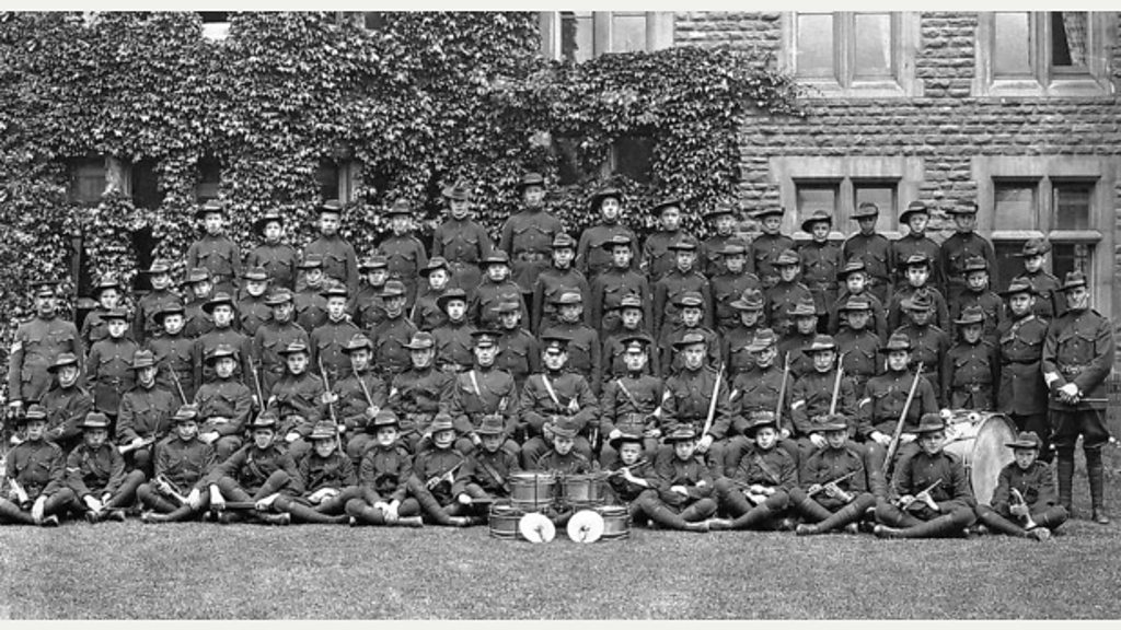 Seventy-six former Monmouth School pupils were killed in WW1. Dr Steven Connors, Headmaster, pays tribute to the young officers who served and those that lost their lives. Dr Connor also provides an insight into the effects of the Great War on Monmouth School between 1914 and 1918. One of the myths surrounding WW1 is that the upper classes and highly educated got off lightly. However, it could be said that the more exclusive your education, the more likely you were to die, as the chances of young public school officers surviving during the First World War were scant. It was the job of Junior Officers to lead the way over the top and expose themselves to the greatest danger as an example to their men. Some 12% of the British army's ordinary soldiers were killed during the war, compared with 17% of its officers. One of these officers was Wales International rugby player, Horace Wyndham Thomas. He entered Monmouth School on a scholarship from Bridgend County School and was killed in The Somme. Another young officer who survived the war was Angus Buchanan; an inspiration in both war and peace. He lost his sight whilst saving two men in the First World War for which he earned the prestigious Victoria Cross. He received the award on the 8th November 1917, when thousands had gathered for the investiture of King George V of 127 recipients of gallantry medals and other honours. Each man was clapped as he approached the royal dais. However the loudest round of applause, from soldiers and civilians alike, was reserved for a uniformed officer and former pupil of Monmouth School, who was led to and from the dais by a chaperone who kept a firm grip on the now blind Angus Buchanan’s left arm. Despite losing his eyesight in battle, he went on to study law and led an active professional life as a solicitor. At the time there were no legal books in braille so the books had to be read to him by somebody – which he then had to memorise. A number of members of staff joined the forces: Mr Elstobm for example, became Captain in the Monmouthshire Regiment, whilst the French teacher, Monsieur Camous, joined the French Army . The Headmaster, Lionel James, threw himself into the town’s war effort. The OTC went on night marches and engaged in trench-digging and signalling exercises. Matches were played to raise money for the troops. The School’s rifles and playing fields were given over to the National Training Volunteer Corps, a Great War equivalent of the Home Guard. In total, 76 Old Monmothians were killed in the First World War and they are remembered on the schools war memorial. At the unveiling, Angus Buchanan expressed ‘the hope that the war memorial, a simple granite cross would never be a mere ornament, but always a true and lasting memory to those who gave their lives. ‘ The War had one beneficial effect in that it brought the school and town closer together. Masters began to play a part in town affairs, with Captain Elstob becoming a member of the Council and eventually Mayor of Monmouth. Location: Monmouth School, Almshouse Street, Monmouth, NP25 3XP Image courtesy of Monmoth school archives shows a band of smiling cadet soldiers, before the outbreak of war Contributor: Dr Steven Connors, Headmaster, Monmouth School Music: Monouth Boys School Choir