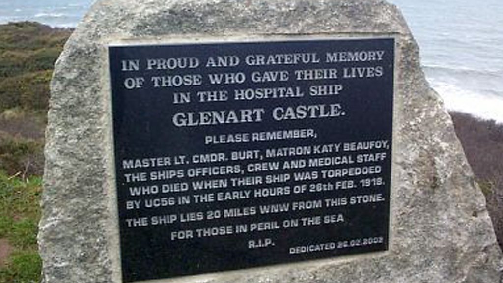 In 1918, in the Bristol Channel – 20 miles from Hartland and 20 miles from Lundy – two hospital ships were torpedoed and sank. The Rewa was attacked by U-boat 55 on 4 January 1918. It was reported that the torpedo went directly through the red cross insignia. The ship was sailing from Greece towards Avonmouth with 279 patients, many suffering from malaria. All of the wounded, plus the crew of 207 and 80 medical staff survived, but three Lascars (Asian seamen) died at sea. Before the war, the Rewa had been part of the British India Line. The wreck of the Rewa has collapsed but the ship’s bell, a porthole with glass, an egg poacher and an empty champagne bottle; have been recovered. The Rewa was the sister ship of the Rohilla, the first hospital ship lost during World War One. On 26 February 1918, the Glenart Castle was torpedoed in the same stretch of water. U-boat 56 attacked in the early hours of the morning. More than 150 people died. Only 38 survived. Both the captain and the matron were lost. They are remembered with the officers, crew and medical staff on a memorial stone on the cliffs off Hartland Point. Today the wreck of the Glenart Castle lies underwater, but is intact. The ship’s bell has been recovered, along with crockery marked with the Union Castle Line crests. Two plates were donated to the families of the captain and the matron. Location: Hartland Point, Hartland, Bideford EX39 6AU Image: Memorial stone in the cliffs off Hartland Point