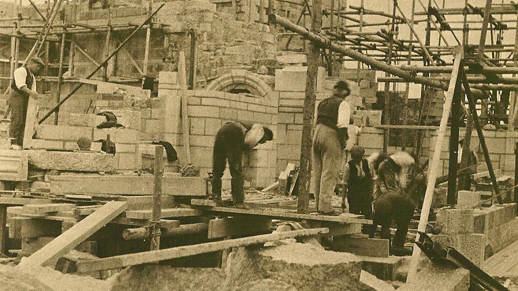 Devon’s Downton is considered to be the ‘last castle to be built in England’. Castle Drogo is the story of one family, one village and a world at war. It tells us about class, conflict and community. The building is also a memorial to a lost heir. His memory is in its mortar. Work on Drogo began in 1912. Overlooking Dartmoor and the Teign valley, it was to be the family home of the Drewes and paid for with money amassed from Home and Colonial Stores. Julius Drewe commissioned Edwin Lutyens to design the castle and grounds. Lutyens would also design the Thiepval memorial and the Cenotaph. His contribution links local, national and international memory. Built from local stone, the castle required skilled workmen from the villages of Drewsteignton, Chagford and Moretonhampsted. In 1914, many of those men enlisted along with the three Drewe sons. Like many of the craftsmen, Adrian, the heir to Drogo, died at war. The building work was curtailed and the castle was not completed until 1930. It includes a memorial room to its lost son. Its walls are memorials to its lost community of craftsmen. Location: Drewsteignton, Castle Drogo, Devon EX6 6PB Image: Construction of Castle Drogo, courtesy of the National Trust