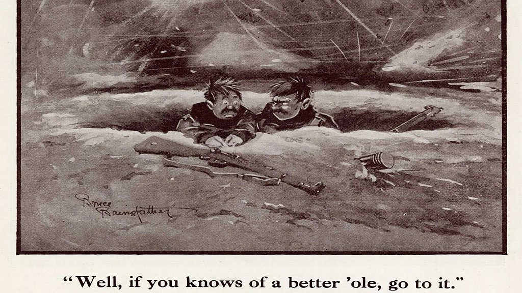 “Well, if you knows of a better ‘ole – go to it…” These are the words of a cartoon drawn during WW1 which connected so truthfully with the resigned humour of soldiers in the trenches that it became a catchphrase used by world leaders as well as the general public. The cartoon is a simple one, which is perhaps why its humour still rings true today. Two bareheaded soldiers, up to their chests in a shell hole, bleakly survey the grim moonscape of the battlefield around them. Nearby, an unexploded shell is seen; its nose threateningly buried in the mud. One looks to the other and utters the now famous phlegmatic line. The “Better ‘Ole” cartoon, as it’s become known, was drawn in Wiltshire in 1915, at Greenhills, now a nursing home in Sutton Veny. The original drawing has survived, and on the reverse has the address "34th Div HQ, Greenhill, Sutton Veny" written in Bairnsfather's handwriting. Its significance as a cartoon, and as a universally accepted comic reference, is well-known. Mark Warby has researched Bairnsfather’s work. He says that Bairnsfather joined the army at the outbreak of war and was sent to France as a second-lieutenant in the Royal Warwickshire Regiment. In the trenches of Flanders, as a form of amusement to cheer his comrades, he would draw cartoons of a sort on the walls of a farmhouse or sketch his thoughts on scraps of paper and pass them along the trench. From these beginnings came the characters of Old Bill, Bert and Alf and the Fragments From France. Old Bill was Bairnsfather’s most well-known, iconic, character and would appear regularly in his work, under the banner title, “Fragments from France”. His first published cartoon appeared in The Bystander magazine in March 1915, after he’d speculatively submitted it thinking it ‘was in their line’. Having been wounded serving with the Warwicks; Bairnsfather was attached to the 34th Division from September 1915 until January 1916. He was based at Sutton Veny near Warminster, as a machine gun instructor. By this time Bairnsfather's name was well-known. During the few months he was stationed at Sutton Veny he would have completed many original 'Fragments from France' for publication. Among these was his most famous, “better ‘ole” cartoon, published in The Bystander on 24 November 1915. The cartoon was incredibly popular when published, and since then Bairnsfather's caption has been 'borrowed' by other cartoonists and political figures. Bill Tidy is a celebrated modern day cartoonist. He says that Bairnsfather had a rare talent in humorously portraying universal suffering: “The acceptance of awfulness, I think, is what comes to soldiers after a while. None of Bairnsfather’s work is condescending. This is the way people spoke and this is the way they acted. He [Bairnsfather] knows when to drop an ‘h’ and it works; it stands the test of time.” The cartoonist wrote about his time at Sutton Veny in his second autobiographical work, "From Mud to Mufti" - published in 1919, which recounts his career in the war from 1915 through to the Armistice. Extracts from two illustrated letters written by him at Sutton Veny were also published in another book about him, in 1916. Location: Sutton Veny, Wiltshire Image: Bruce Bairnfather’s cartoon courtesy of Mark Warby of www.brucebairnsfather.org.uk