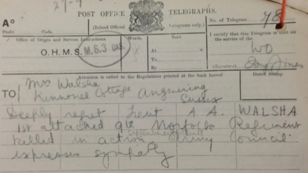 In the mass battles of World War One there were large numbers of deaths and, in many cases, they were in places where their bodies couldn’t be recovered. There was also inexact information about deaths. What relatives were told was often very basic, to the effect that they had been killed, they were missing in action or they were presumed dead. It was usually in the form of a telegram (depending on rank) and hand delivered by someone like a policeman who would bring the information to the house. The family may then eventually receive a letter explaining more about the circumstances of the death and the Imperial War Graves Commission would let them know whether their loved one had been buried and the location of the grave. After the news of the death of a loved one it was then left to the family and the local community to support each other. The way relatives were informed of the death of a loved one during the Great War would vary depending on their rank. For officers the next of kin would often receive a telegram pre-printed in bold and handwritten in italic. There would have been different wording for wounded and missing. Sometimes non-pre-printed forms were used and it would be written by hand, reading: Regret to inform you that Capt. J Smith Gloucester Regt. died of wounds 24 July. Lord Kitchener [or the Army Council, post 1915] expresses his sympathy. Other ranks were usually notified by post, using Army Form B 104-82, though sometimes telegrams were used. If the serviceman was missing rather than known to be killed, Army Form B. 104-83 was used and if wounded it would be Army Form B 104-81. Where the location of a grave was known Army Form B 104-121 was sent later. Next of kin would also sometimes (if circumstances permitted) be sent a death certificate and a report of the serviceman’s burial. Commanding officers would also often write to the next of kin, as would army chaplains (attached to the unit, or perhaps to a hospital where the soldier died), and the friends of the dead serviceman. These would also usually follow the official notification, though sometimes they preceded it. Sometimes, the next of kin would discover the death of a loved one when casualty lists were posted outside places like town halls especially if a family had moved or the War Office had a wrong address. Buckingham Palace also sent out telegrams of sympathy. These would arrive some days or weeks after the official notification. It’s now the role of the Joint Casualty and Compassionate Centre at Imjin Barracks in Gloucestershire to deal with the death of a serving soldier. A team of people are on hand 24 hours a day to take the initial call from a unit. They will be given basic details and it is then their job to contact the relevant people needed to inform the family. Once all the relevant family members have been informed letters of condolence are sent from their Commanding Officers and in addition now the family will receive letters from senior politicians. Anyone who dies in the armed forces is entitled to a military funded funeral. In addition if they die overseas they will now repatriate the body to the UK. The Military will also offer to mark their grave with a military pattern headstone. Following the funeral the family will then be offered further help and support if necessary. Location: Imjin Barracks, Innsworth, Gloucester GL3 1HW Image: A telegram was often all a family would receive to tell them that their loved one had been killed in the war