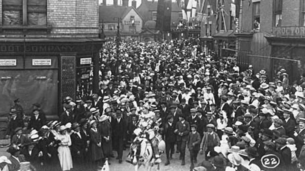 Whilst the armistice began on 11 November 1918, the Treaty of Versailles, which marked the actual end of World War One wasn’t signed until the following June. Whilst there had been spontaneous celebrations in November, by 19 July 1919, official Peace Day celebrations had been organised throughout Britain. The town of Uttoxeter held its own street party with entertainment and marches. Those in the crowd that had lost relatives during the war were probably wearing a specially designed brooch to remember the dead. Unlike other towns and villages, a portrait of the dead soldiers had been specially painted in its centre. The look of the town remains very much the same today with one notable exception. Today there is a war memorial on the market place – in 1919 it had yet to be built. Location: Uttoxeter, Staffordshire ST14 7HP Image: Peace day celebrations in Uttoxeter, courtesy of Staffordshire County Council