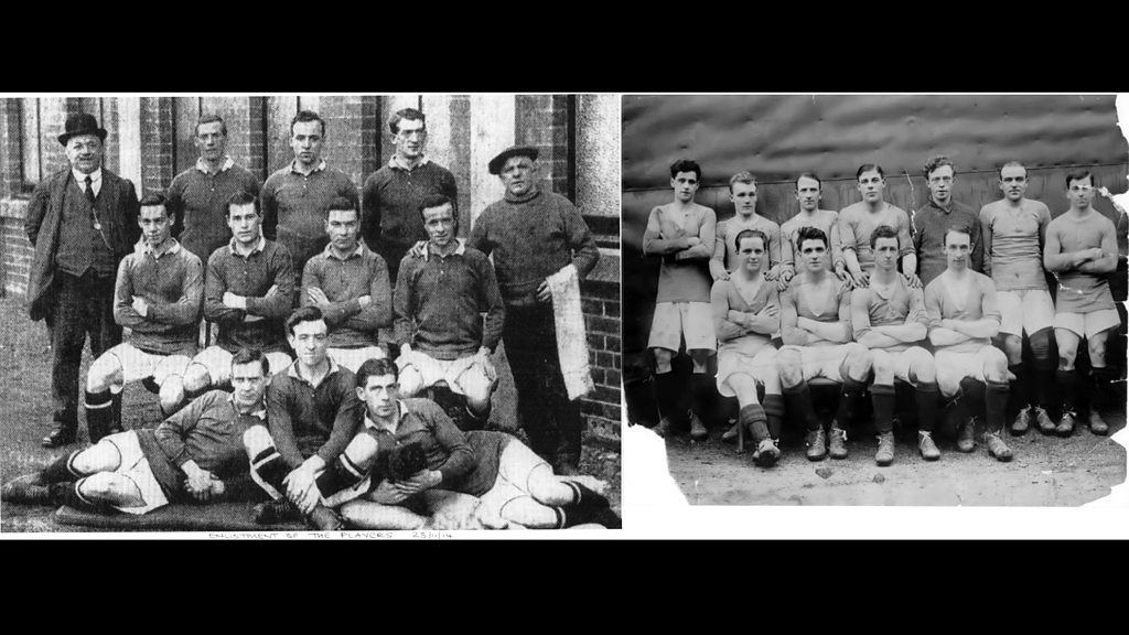 EH12 5EY The declaration of war occurred on the 4th of August 1914 and the Scottish football season started the following week. Hearts Football Club was riding high at the top of the league and were expected to win the championship that year. But as Hearts FC historian David Speed explains, as the conflict unfolded, many questioned whether football should be played at all: “There was a crusade to stop the playing of professional football. It was seen by many as disgusting that football was being played as men were dying in the war. The players came under increasing pressure through the press – some really nasty letters were sent.” Hearts players responded to the pressure by volunteering to join Kitchener’s army or becoming involved in war related work: sixteen players in total. Across the city, Hearts’ arch rivals Hibernian Football Club were also doing their bit for the war effort: “Within a few days of the start of the war, seven Hibs players had either joined up or had become involved in war work,” says Hibs FC historian Tom Wright. “Even before conscription teams like Queens Park, Falkirk and Dunfermline – they all played a massive part.” Many of the Hearts and Hibs players joined the 16th Royal Scots Battalion – popularly known as Macrae’s Battalion after its founder Sir George Macrae. “The 16th Royal Scots went to France in summer 1915. In early 1916 they were sent down to Albert on the Somme to prepare for the big push on the 1st of Jul 1916 which became known at the Battle of the Somme,” says David Speed. “After the initial bombardment, the 16th Royal Scots advanced uphill, their objective being the village of Contalmaison. But the bombardment had not damaged the German’s trenches or their barbed wire and there was wholesale slaughter of the British men.” Twenty thousand soldiers were killed on the first day of the Somme. Macrae’s Battalion lost 570 men and 35 officers attacking Contalmaison. Three Hearts players died in the assault and four other players died later in the war. This year a plaque has been unveilded at Hearts’ stadium Tynecastle to commemorate the players who signed up and every year there is a service of Remembrance at Edinburgh’s Haymarket Clock Tower Memorial, built to honour the Hearts players who served. Images courtesy of David Speed (Heart of Midlothian FC) and Tom Wright (Hibernian FC)