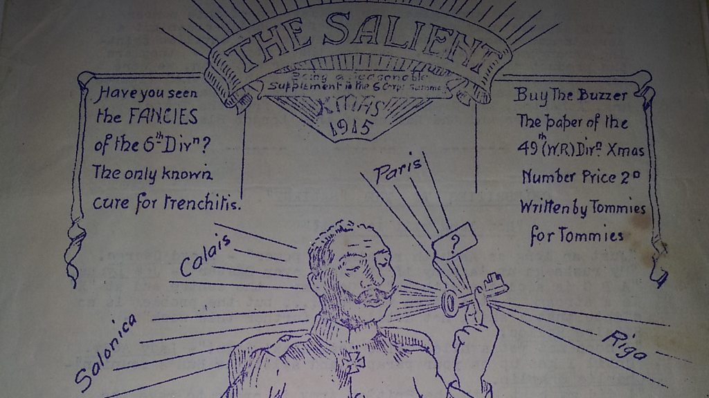 The Salient was one of many trench journals written and published by, and for, the troops. It was published at Christmas 1915 and therefore pre-dated the better known British trench journal “The Wipers Times”. Contributions for The Salient came from some of the West Ridings troops belonging to the VI Corps. Only a few known copies of this journal still remain and one can be found in the West Yorkshire Archives at Huddersfield Library. On the front cover there is an advertisement for a publication by the Huddersfield Battalion and also a concert by ‘The Fancies’, a troupe referred to by a Huddersfield private, Freddie Smith, in his letters home. Location: Huddersfield Library, Princess St, Huddersfield, West Yorkshire HD1 2SU Image: Front cover of a publication of the Salient Times, courtesy of The Duke of Wellington's Museum Archive and West Yorkshire Archive Service, Kirklees Presented by Jane Chesworth