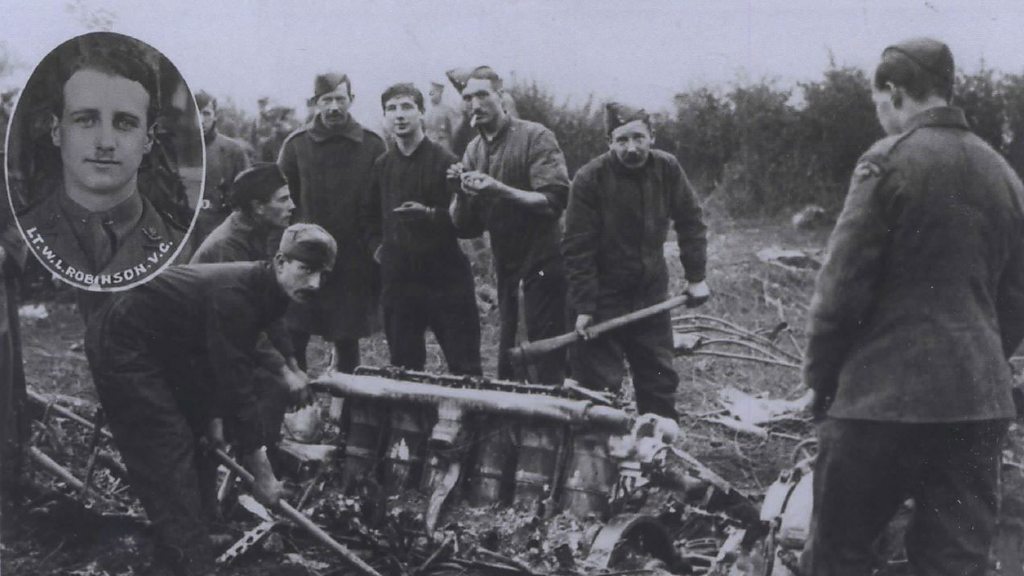 The first German airship to be shot down in the UK was destroyed over Cuffley in Hertfordshire. Flying on the night of 2 September 1916, the SL-11 was one of 16 airships taking part in the biggest raid to date. Among the pilots scrambling to counter the attack was Lieutenant William Leefe Robinson, fighting with the Royal Flying Corps. He attacked the airship from beneath with machine gun fire. It burst into flames and crashed in a field behind the Plough Inn at Cuffley, killing all sixteen men on board. Lieutenant Leefe Robinson was awarded a Victoria Cross for his actions, which helped to bolster public morale and a memorial to him was erected close to the site of the crash. Location: Cuffley, Hertfordshire EN6 4DW Image: The scene where the Zeppelin landed with Lt Robinson (top left), courtesy of Potters Bar and District Historical Society