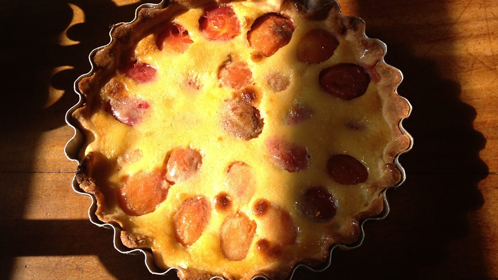 Christopher Trotter shows Clare English how to make plum clafoutis