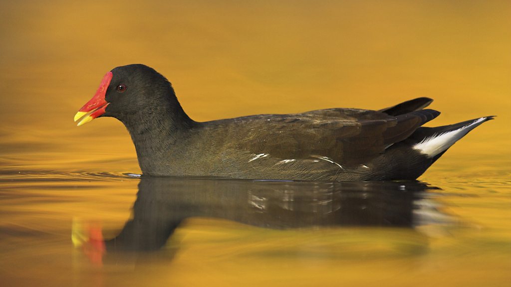 Tweet of the Day is a series of fascinating stories about our British birds inspired by their calls and songs. Chris Packham presents the story of the Moorhen. Almost anywhere there's freshwater you might hear or see a moorhen. They're easy to identify from their red and yellow bill, red shield on the forehead and green-ish yellow legs with a red patch that looks like a garter.