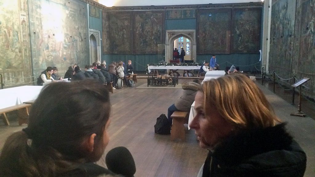 Nia Roberts yn sgwrsio efo Eleri Lynn a Branwen Roberts, am eu gwaith yn gofalu am y casgliad gwisgoedd a thecstiliau brenhinol ym Mhalas Hampton Court.