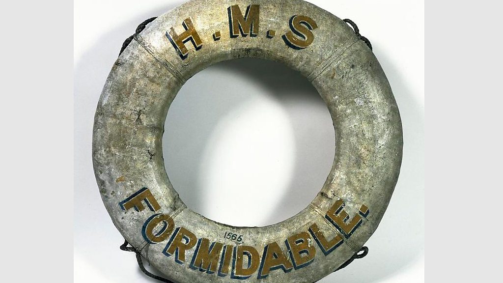 On New Year’s Day, 1915, the British Navy lost its first battleship in a submarine attack. HMS Formidable was sunk in Start Bay, 23 miles east of Start Point. Altogether 547 men and the captain’s dog Bruce, were lost. Survivors reported seeing the second in command, the ship’s chaplain and Captain Arthur Loxley smoking pipes as their ship went down. However, 199 men survived. Some were picked up by the naval vessels Topaze and Diamond, others by the Brixham trawler Provident, and 51 rowed in raging seas to Lyme Regis. The Provident, owned and captained by William Pillar, was part of a dramatic rescue of 71 sailors, who were landed at Brixham and are remembered in the town’s museum. Of the 51 who arrived at Lyme Regis, 48 survived. They had rowed 41 miles and for 22 hours. The men were cared for in the Pilot Boat Hotel. The landlady’s dog, a rough-haired collie called Lassie, licked one seaman back to life. Lyme Regis buried six men of the Formidable and the ship’s memorial is in the town’s cemetery. The body of the captain’s dog (an Airedale terrier) was washed up near Abbotsbury. Bruce is buried there. Location: Start Bay, Kingsbridge, Devon TQ7 2ET Image: A life belt from HMS Formidable