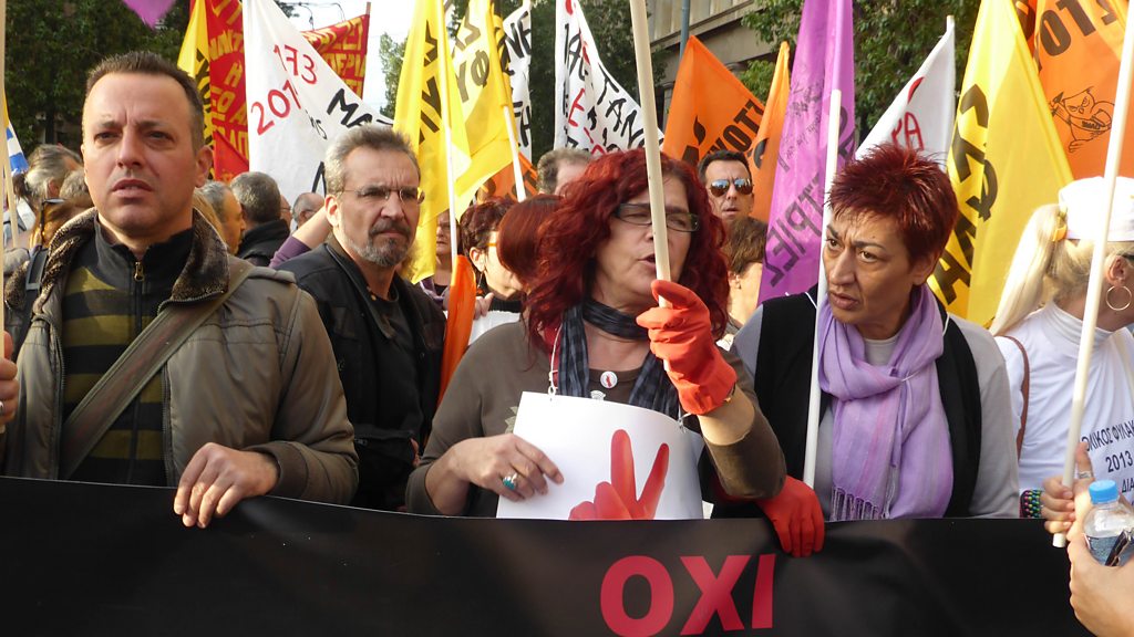 The cleaners whose protest has captured the imagination of those opposed to the harsh austerity programme in Greece. Mostly middle-aged or nearing retirement, they have refused to go quietly. The women have kept up a day and night vigil outside the Finance Ministry in Athens, taken the government to court and resisted attempts by the riot police to remove them by force. They have challenged representatives from the International Monetary Fund and raised their red rubber gloves in a clenched fist at the European Parliament. Some say they represent the plight of many women and the poorly paid, others that they are being manipulated by the left. Maria Margaronis hears the women's stories and asks what makes them so determined. Produced by Mark Savage. (Photo: Cleaning ladies from Greece’s Finance Ministry, taking their protest onto the streets. Credit: BBC)