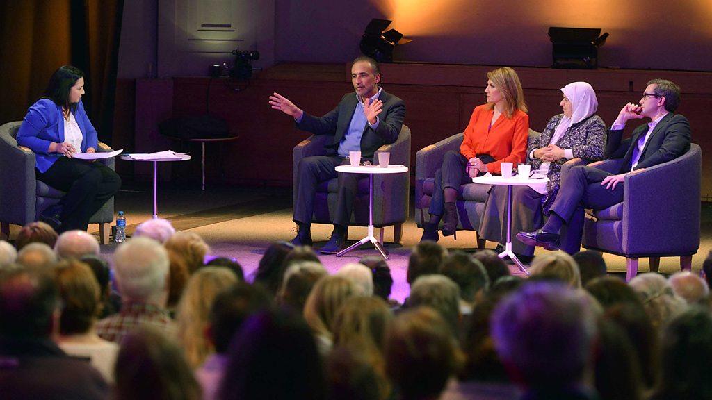 Shaimaa Khalil chairs a live debate on Islam and democracy with Tariq Ramadan, Heba Raouf Ezzat and Shurooq Amin in London. (Photo: From left to right, Shaimaa Khalil, Tariq Ramadan, Shurooq Amin, Heba Raouf Ezzat, Douglas Murray)