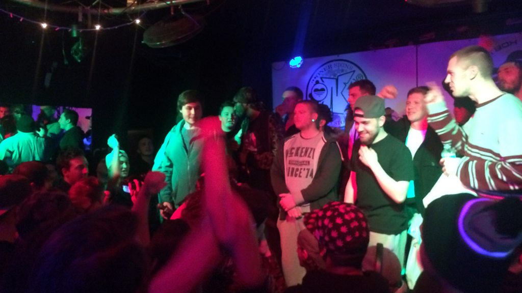 Gwyn yn dal fyny hefo trefnwyr y noson, Mr Phormula, a "Chubbs" - un o'r cystadleuwyr.