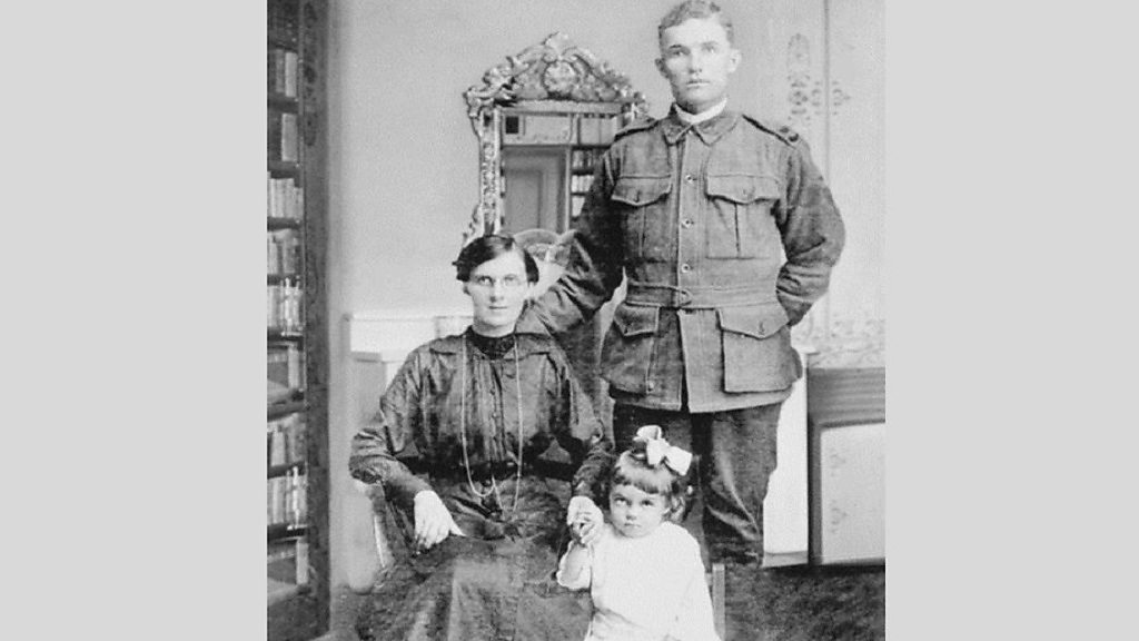 Nine Australian soldiers from the World War One are buried in a large municipal cemetery in Northampton. How did they end up here, ten thousand miles from home? Each story can tell us much about the plight of soldiers on the Western Front and their families left behind in Australia, with service records including correspondence between families and the War Office. Take Charles McGoldrick (pictured with his family), a 25-year-old miner from New South Wales who had a pregnant wife, Sarah, and an infant daughter. He joined the 1st Battalion, Australian Infantry and arrived in Europe in May 1916. He was wounded in action on 18 August 1916, to his right leg and his spine. Four weeks later he died in hospital of pneumonia, having had his right leg amputated. His wife received two charms, a ring, three coins, some photos and his watch. Sarah wrote to the War Office questioning their version of events – she had heard from him to say he was well though wounded. His daughter, Adeline, whom he never met, died in the same month; September 1916. Location: Towcester Road, Northampton NN4 Image: Charles McGoldrick with his family, courtesy of Sydney Donaldson