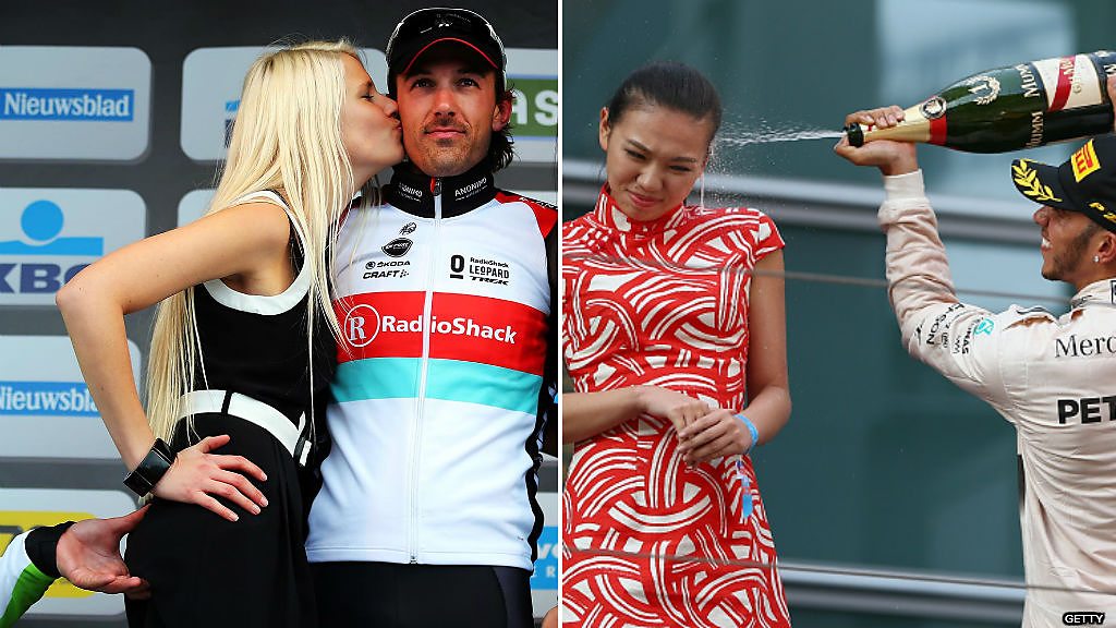 Last week in celebrating winning the Chinese Grand Prix Lewis Hamilton sprayed champagne liberally on the winner's podium and in the process directly in the face of one of the podium hostesses. It thrust Liu Siying, who says she wasn't offended, into a media storm. So what is that like? We speak to Maja Leye who in 2013 had her bottom pinched by cyclist Peter Sagan whilst presenting flowers to the winner of the Tour of Flanders. She explained to the BBC's Caroline Barker how that event changed her life and what she made of the incident in the Chinese Grand Prix. Maja's also explains about her role, which unusually for a podium hostess, includes being part of the organising committee of cycling "Spring Classics" Photo: (L) Race winner Fabian Cancellara stands on top of the podium as Peter Sagan pinches the bottom of podium hostess Maja Leye on the 97th Tour of Flanders March 2013 (Credit: Bryn Lennon/Getty Images) Photo (R) Race winner Lewis Hamilton celebrates on the podium during the Formula One Grand Prix of China April 12 2015 (Credit: Clive Mason/Getty Images)