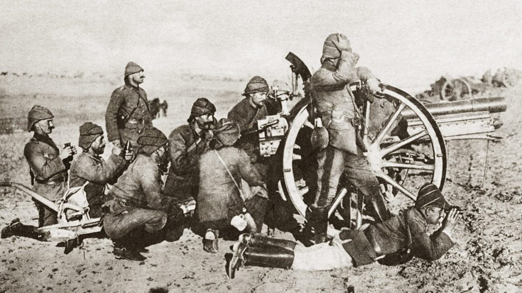 In this report from the landing beach in Gallipoli, we hear archive of survivors. Mark Lowen also speaks to a descendent of Private Thomas Austin Toohey of the Royal Dublin Fusiliers, and a Turkish tour guide in the area, who talks about modern-day Turkey's view of the Campaign. (Credit: Turkish artillery in position at Gallipoli, 1915) (Credit: The Granger Collection/TopFoto)