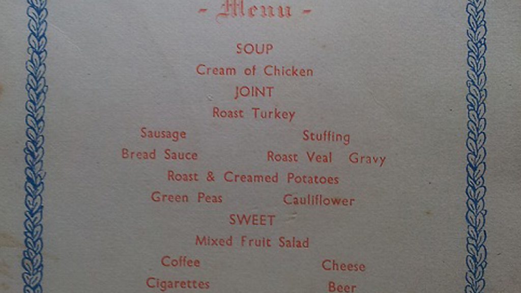 Will Sutcliffe from Hebden Bridge was am engineer in the RAF during World War Two. Posted out to Iceland, Will celebrated VE Day with colleagues on the airbase. He remembers a joyous atmosphere but most of all the hearty meal they were given. On the menu was soup, roast turkey, sausage, veal, potatoes, peas and a cold beer. It was more than they were used to. Celebrations were short as the war with Japan was still ongoing. Many of Will's peers were re-patriated and then sent out back out to the Far East. Image: The menu Will enjoyed on VE Day.