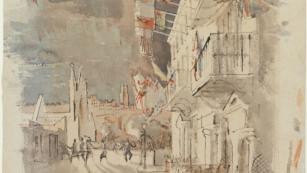 Painter and teacher Clifford Ellis was a shy and quiet character, so it is no surprise that his painting of people celebrating in Bath on VE Day is discreet and understated. Clifford was a graphic artist and illustrator, working mainly with his wife, Rosemary. In collaboration they designed pieces for Shell, The General Post Office and London Transport. As well as this he was also the Principal of Corsham Court at the Bath Academy of Art. Two artists who worked under Clifford and knew him well, are John Eaves and Michael Pennie. They describe Clifford’s VE Day scene and the personality behind the painting. Interview with John Eaves and Michael Pennie Image: VE Day in Bath, courtesy of the Imperial War Museums