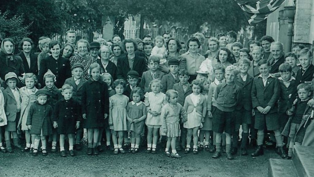 Tony Snow was 9-years-old in May 1945, and lived on Horse Fair Street, Charlton Kings in Cheltenham. Tony’s parents had an old fashioned grocery shop which opened seven days a week. Although only a boy Tony helped out serving people selling alcohol and tobacco. There were no fridges, but a larder which kept cheese and butter cool. Tony is the boy in the middle of the photograph looking directly at the camera wearing a shirt, tie and blazer. He remembers some of the other children pictured surrounding him. Over 60 children and adults assembled for the photograph on Horse Fair Street. St Mary’s Church can be seen in the background with The Royal Charlton Kings pub hanging the Union Flag on the right hand side. Prior to the photograph being taken the children had running races in the street. After VE Day, Tony remembers enjoying his first ice cream but disliking his first banana. It was a huge relief that war in Europe was over. Although Charlton Kings was not badly bombed, hearing about the atrocities in the news was enough to frighten any child. Tony kept a copy of the local newspaper from VE Day. The Echo on Tuesday 8 May 1945 had the headline: “The World Surrenders to VE Day Joy! A nightmare has passed we can breathe again and Cheltenham lets itself go.” Image: Courtesy of The Gloucestershire Echo