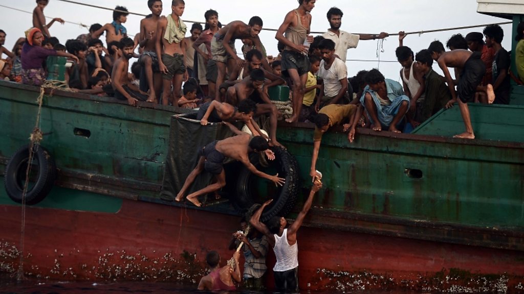 The BBC's Jonah Fisher on the plight of Myanmar's Rohingya after dozens are found cast adrift at sea. (Picture: Rohingya migrants pass food supplies dropped by a Thai army helicopter to others aboard a boat drifting in Thai waters off the southern island of Koh Lipe in the Andaman sea. Credit: AFP/Christophe Archambault.)