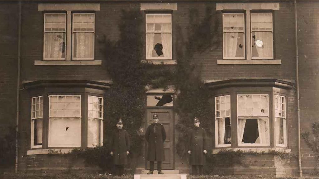 A few days after the sinking of RMS Lusitania in May 1915, a huge anti-German riot took place in the small market town of Crook in County Durham. Some newspaper reports suggested it involved ten thousand people, more than were actually resident in the town according to the 1911 census! Anti-German riots took place in many cities, but the Crook riot was unusually large for such a small town with no direct connection to the Lusitania. The disturbance focussed on two pork butchers shop, one was run by Anthony Bauman (or Bowman) a naturalised German, and by John Hodgson who had no apparent German connections. Nineteen men and one woman were charged with various offences in connection with the riot. Although fourteen of them were found guilty and fined, the sentences could have been much more severe possibly reflecting a degree of public sympathy with the rioters. Location: Hope Street, Crook, County Durham DL15 9HU Image: Police officers manning a house following the riot. Photograph courtesy of Michael Manuel.