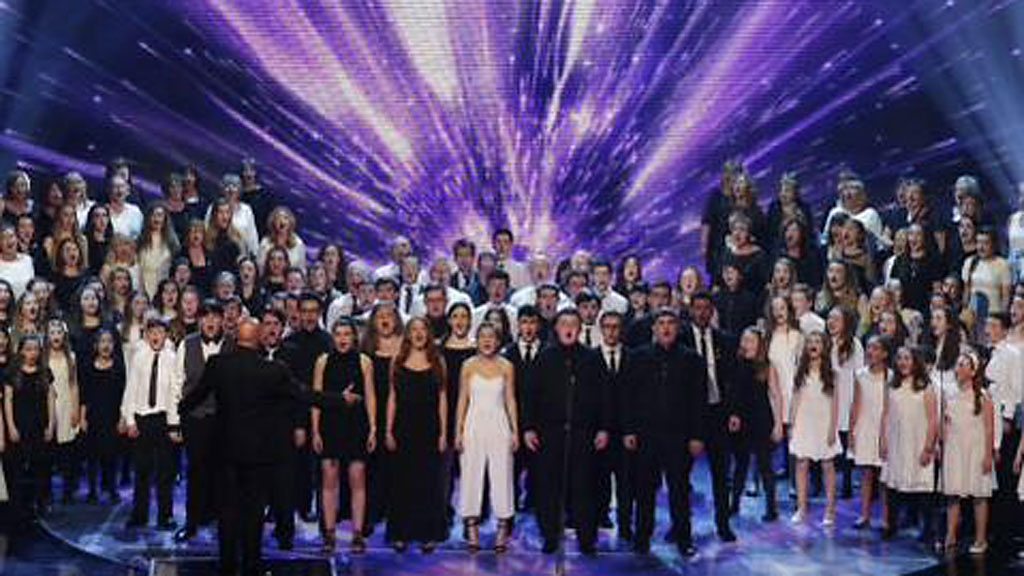 Cefin Roberts ac aelodau Cor Glanaethwy yn son am eu profiadau ar Britain's Got Talent.
