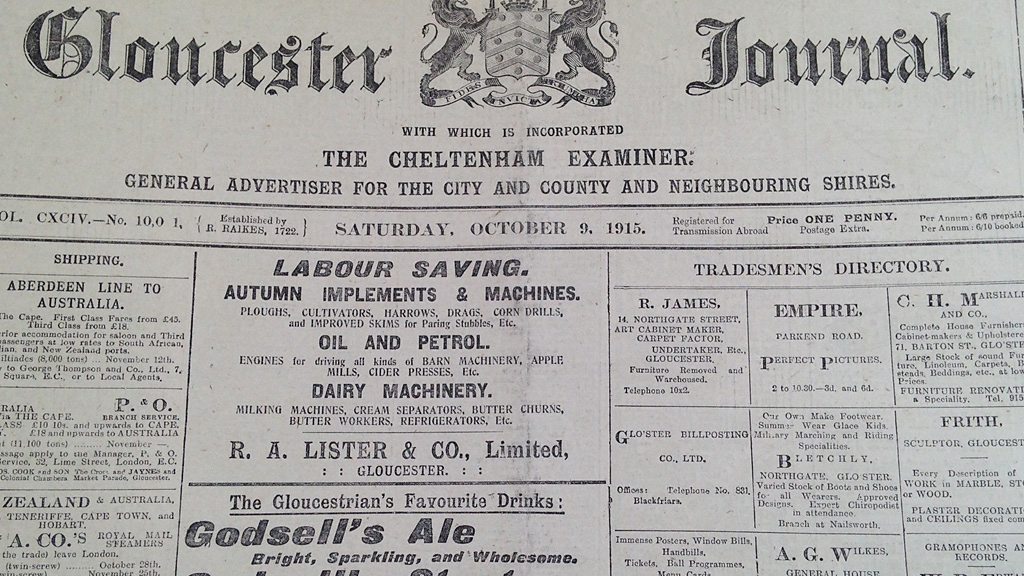 Reporting the war was heavily censored as the government controlled the flow of information from the front line. Apart from letters from soldiers written home to loved ones, newspapers were the main source of communication. Public radio broadcasts did not start until 1922. With the British ‘stiff upper lip’ and War Office’s tight regulation of the press, most war stories did not even make the front page of local newspapers. Jenny Eastwood, editor of the Gloucester Citizen Newspaper and Chris Chatterton, director of the Soldiers of Gloucestershire Museum, have been in the Gloucestershire Archives turning the pages of various Gloucestershire newspapers from 1914 to 1918. Chris has been comparing the accounts written in the Battalion War Diaries with the newspapers reports, and Jenny has cast her journalistic judgement over those 100-year-old newspapers. One notable feature of the newspapers is the dominance of advertising on the front pages. This is where we expect to see today’s main news stories, but a century ago the news of the soldiers on the front line was often saved for the back page. Not only was the information buried on latter pages, it often omitted vital facts. Chris and Jenny explore the Battle of Loos – a major offensive in September 1915. The 10th Battalion, The Gloucestershire Regiment described in the official war diaries of difficult, wet conditions in the trenches moving heavy cylinders of poisonous gas to the front line at night. When this key battle was reported in the Gloucester Journal October 1915 there was no mention of the use of poisonous gas. The attempt had been unsuccessful with an unfavourable wind meaning the gas settling back in the British trenches, gassing many of the troops. Censorship of the press held back the information about how unsuccessful the poisonous gas had been and no doubt the government did not want to draw attention to its use, as only months before the German Army had been severely criticised for using such means of attack. Presented by Jenny Eastwood, Editor of the Gloucester Citizen Newspaper and Chris Chatterton, Museum Director of the Soldiers of Gloucestershire Museum. Location: Gloucestershire Archives, Gloucester GL1 3DW