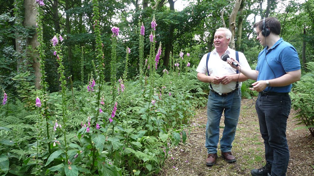 Chris Skinner shows Paul Hayes some of the foxgloves in the woods on his farm.
