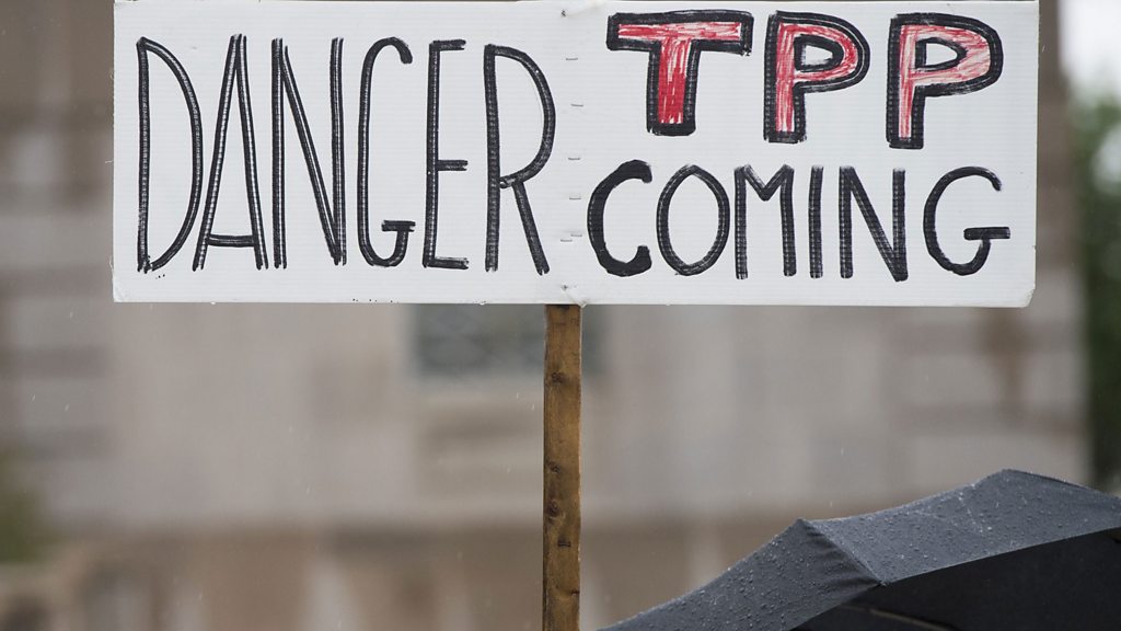 It is probably the biggest trading deal you will never have heard of - the Trans-Pacific Partnership or TPP. As leaders prepare to negotiate this new trade deal for the Asia Pacific region, why is President Obama so determined that the US will be part of it when it is so unpopular with his voters? If he is trying to counterbalance Chinese power in the region, will it work? And what will TPP mean for businesses and consumers the world over? Manuela Saragosa and a host of distinguished guests, including the man who once advised George W. Bush and who is now with the Carnegie Endowment for International Peace; Ashley Tellis, the Chief Strategist at Silvercrest Asset Management and Patrick Chovanec; Evan Greer of Fight for the Future, a US campaign opposing TPP. And, to consider the Chinese perspective on TPP, from Manchester in the UK, the economist and academic Dr Xiaobing Wang. (Photo: A banner reads 'Danger TPP coming'. Credit: AFP)