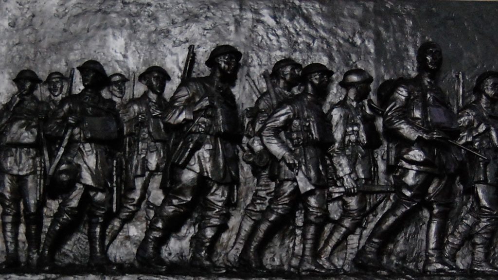 The Robin Hood Rifles or the 'Robin Hoods', as they were popularly known, were a territorial force that recruited almost exclusively from Nottingham. They formed the 7th Battalion of the Sherwood Foresters and as the 1/7th (Robin Hoods) fought on the Western Front from 1915 to 1918, suffering so many casualties the unit was disbanded before the Armistice. Like all members of the Territorial Army, the Robin Hoods were ordered to mobilise immediately after the outbreak of war and within a week crowds gathered from the Market Square to Canning Circus to watch them march to their Brigade Assembly. Most of the men came from the poorer parts of the city, the Broadmarsh and Narrowmarsh, slum areas that have since been pulled down. John Cotterill, who's a founding member of the Guild of Battlefield Guides, says: "Almost to a man they volunteered for overseas service" and in 1915 they were among the first soldiers to endure a liquid flame attack by the Germans. They took heavy casualties at Loos in 1915, Gommecourt on the Somme in 1916 when only 90 returned from a fighting force of 627 and in the Kaiser's Spring Offensive. On 21 March 1918 the 1/7 (Robin Hood) Battalion, explains John Cotterill, had the “sad distinction” of suffering the largest number of dead and wounded than other British battalions, because they kept fighting. The survivors absorbed in to other units until the end of the war. Two more battalions of the Robin Hood Rifles (The 2/7th and 3/7th Battalions of the Sherwood Foresters) were raised during the war. The 2/7th deployed to Dublin in 1916 to fight the Easter Uprising and then fought on the Western Front in 1917, suffering particularly heavy losses at the Battle of Third Ypres (Passchendaele) in September. The 3/7th remained in the UK training reinforcements for the 1/7th and 2/7th. Location: St Mary’s Church, High Pavement, Nottingham NG1 1HR Image: Bronze Relief Monument in St Mary’s Church, Nottingham