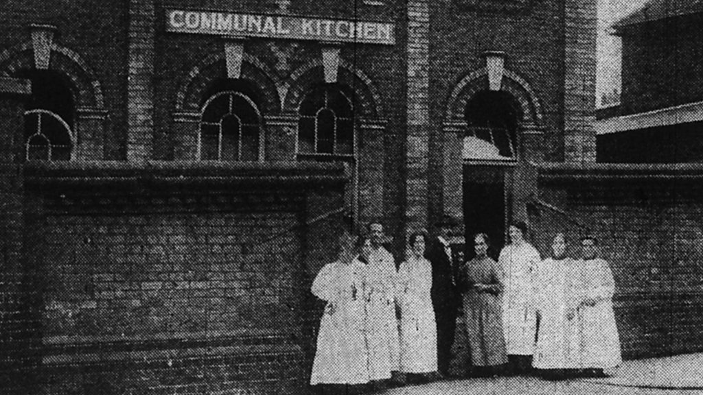 The first Communal Kitchens were started in 1917, as certain food products – including meat – became increasingly difficult to obtain. Reading became renowned as a model kitchen, following the publication of a pamphlet, which was the first attempt to show how to run a kitchen. It included details of equipment, staff and finances and prompted visits to Reading from across the country to see the kitchen in action and adopt ideas, with applications for the pamphlet from overseas, including America. Reading’s first Communal Kitchen opened at the Old British School, Southampton Street on 3 September 1917. It was set up by the Education Committee and run by the Meals Superintendent, Fred Marsh, who wrote the pamphlet. It was, in effect, a takeaway service open from 11.30am to 2pm every day, except Sundays. Customers could purchase tickets for food cooked at the kitchen and they brought their own basins or plates to carry the food home in. A typical menu included soup, roast beef or mutton, fried fish, potatoes, onions or cabbage and puddings such as blancmange and jam, rice pudding or apple dumplings. The one item that proved so popular that it was included daily was beef steak pudding. Newspapers reported that people were so anxious to secure food that they booked their orders and left basins at the kitchen first thing in the morning, returning later to collect the food. Within the first few weeks up to 850 people from all sectors of society were using the kitchen daily and it had already paid its way by the second morning. Two further kitchens were opened in Orts Road and Tudor Road. Mr Marsh engaged staff to run the kitchen, rather than relying on voluntary help, and they were provided with a uniform of sage green overalls, with white collars, caps and sleeves. Lady Ellen Askwith from the Central Committee on Women’s Employment was a keen supporter of the Communal Kitchen and wrote the foreword to the pamphlet, in which she refuted the key objections that it would undermine the influence of the home, leave women with too much time on their hands if they didn’t cook, and that they would never learn or else forget how to cook. A message from Lady Askwith’s husband, when she opened Reading’s second Communal Kitchen in Orts Road, said: “What Reading had done in relation to food education and housing was one of the best examples in the country.” Elsewhere newspapers published menus and dietary advice, and Heelas of Reading organised cookery demonstrations and a lecture by well known Olympic athlete and Restaurateur, Eustace Miles to encourage the take up of ‘Meatless Cookery’. Location: Reading’s Communal Kitchen, Southampton Street, Reading RG1 2QZ Image: Reading’s Communal Kitchen courtesy of Reading Library