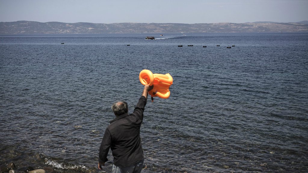 Photojournalist Nicola Zolin describes how Izmir has become a key transit point for migrants and refugees trying to reach central Europe. (Picture: A local man holds up an inflatable life jacket as he waves to a boat full of migrants arriving on the Greek island of Lesbos after crossing the Aegean sea from Turkey/ Credits: Achilleas Zavallis/AFP/Getty Images)
