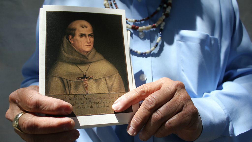 When Pope Francis heads to the US later this month, he’ll put one historical figure— Junípero Serra —in the brightest of spotlights. But while some will celebrate, others— including California’s Native Americans— are more likely to protest. Picture: Andrew Galvan, the curator at San Francisco’s Mission Dolores, holds the invitation to the canonisation of Rev. Junípero Serra. Credit: PRI’s The World