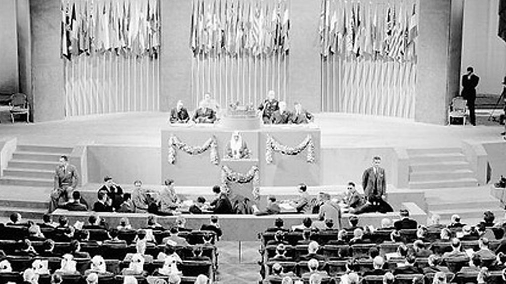 In October 1945, countries ratified the founding charter of a new organsation, the United Nations, that it was hoped would ensure there was never a world war again. Earlier that year thousands of delegates from around the world had met in San Francisco to hammer out the charter. Witness talks to two people who worked for the UN that year; and to historian Stephen Schlesinger. Photo: a delegate from Saudi Arabia addresses the UN's founding conference in San Francisco (Credit: the UN)